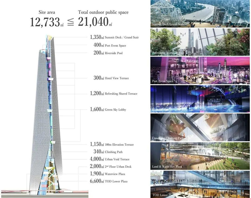與傳統(tǒng)超高層建筑的封閉式設(shè)計(jì)不同,該項(xiàng)目在建筑中開設(shè)了一個(gè)巨大的孔洞“PUBLIC VOID”,將外部環(huán)境引入高層區(qū)域。通過這一設(shè)計(jì),新增的外部公共空間面積達(dá)到2.1萬㎡,是用地面積的1.7倍,從物理層面擴(kuò)展了城市公共空間。設(shè)計(jì)還通過自動(dòng)扶梯連接PUBLIC VOID內(nèi)的公共空間,實(shí)現(xiàn)立體移動(dòng),提升空間流動(dòng)性和體驗(yàn)感。